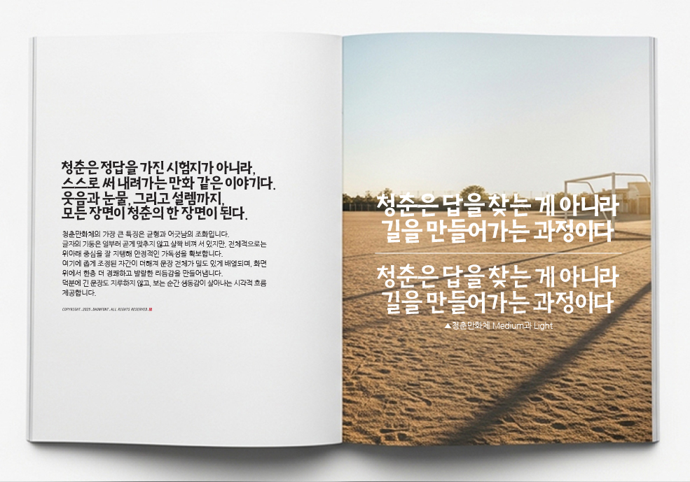Medium은 제목, 광고, 포스터 등 강렬한 인상이 필요한 곳에 적합하고, Light는 SNS 콘텐츠나 감각적인 카피에 잘 어울려 다양한 디자인 환경에서 활용도가 높습니다.
