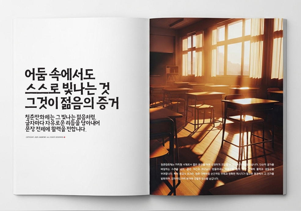 청춘만화체는 2,780자 완성형 한글로 제작되었으며, 정돈된 네모틀 구조 속에서 글자마다 개성과 자유로움이 살아 있어 단조롭지 않고 감각적인 인상을 줍니다. 또한 좁은 자간이 더해져 문장 전체가 밀도 있게 배열되며, 청춘 특유의 경쾌한 리듬과 발랄한 생동감을 전합니다.