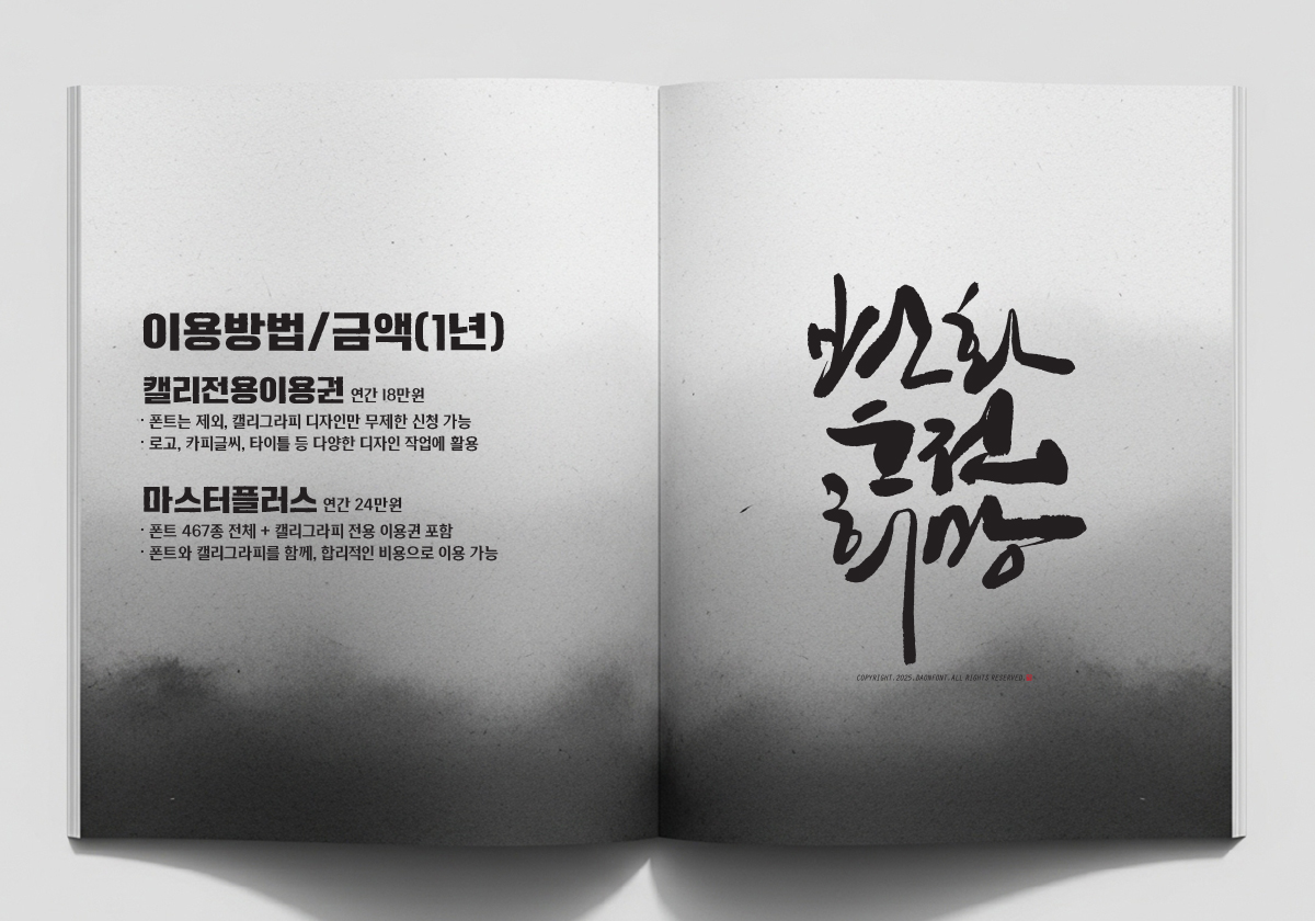 ▶마스터 플러스 – 연 24만원 - 폰트 467종 전체 + 캘리전용 이용권 포함 - 폰트와 캘리그래피를 한 번에 이용할 수 있는 가장 합리적인 패키지